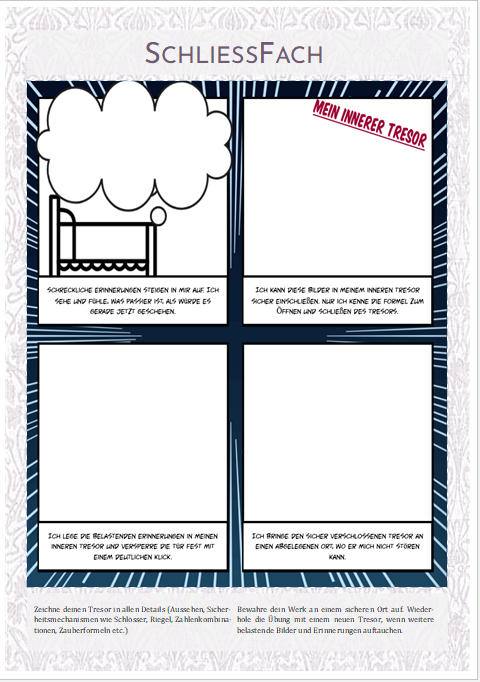 Die Tresorübung ist eine oft in der Traumatherapie eingesetzte Imagination. Sie dient dazu, sich von belastenden Bildern oder Gedanken zu distanzieren. Dazu werden alle belastenden Elemente in einem imaginären Safe aufbewahrt, der sicher und abschließbar ist. Aus diesem Safe können sie dann zu einem späteren Zeitpunkt wieder hervorgeholt und weiterbearbeitet werden – wenn man das möchte.